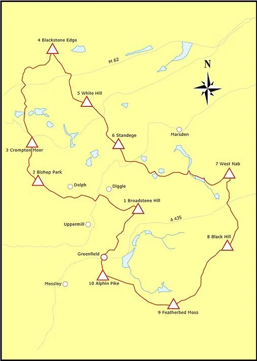 The objective is to visit the 10 trig points listed below starting and finishing at Tanners Mill car park, Greenfield (SE 002 039 ). Use in conjunction with OS Maps OL1 The Peak District Dark Peak area and OL21 South Pennines.
